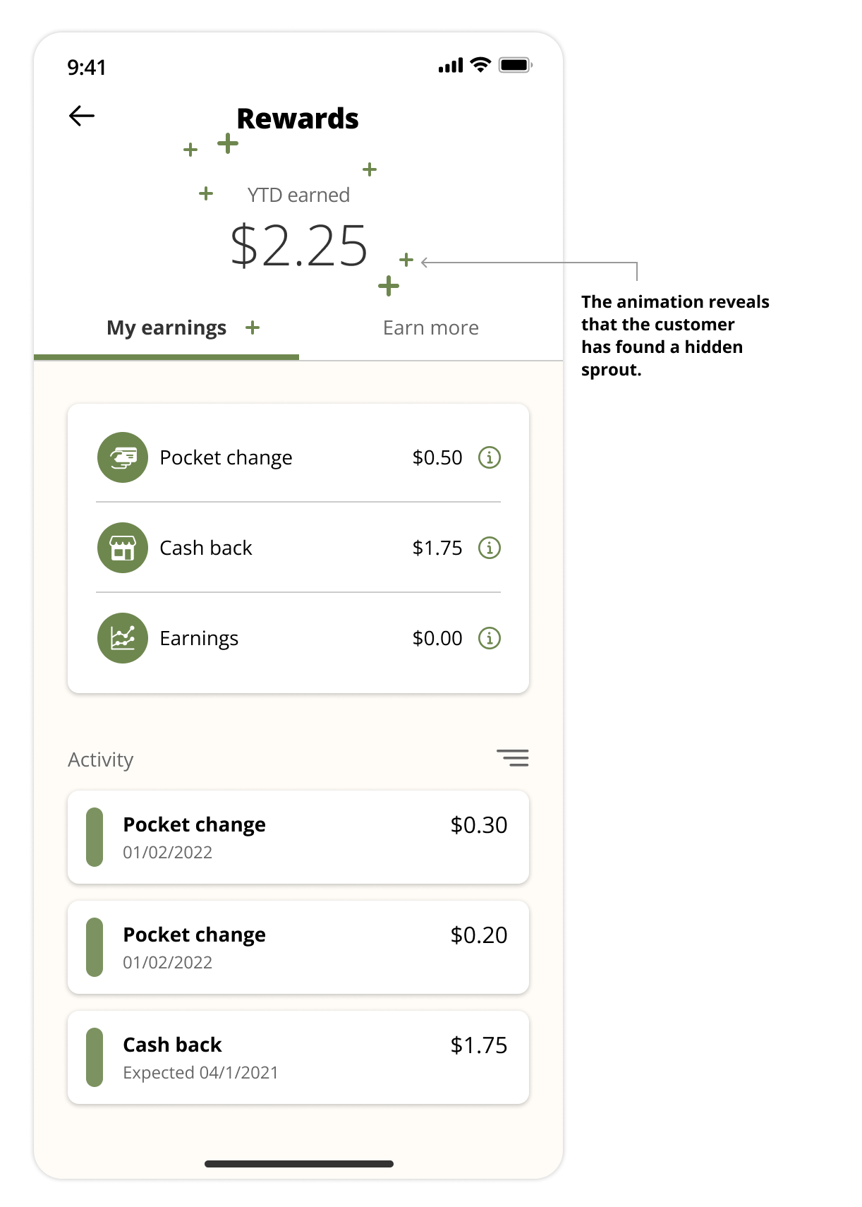 My submission for the hackathon called “Secret Sprouts”, is a system of hidden interactions and features with incentive rewards for the app’s customer base.